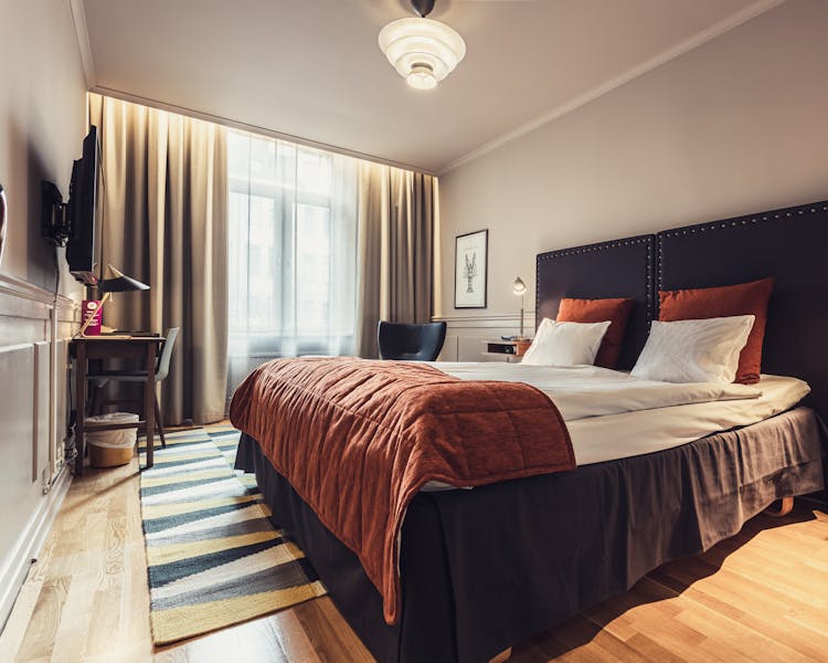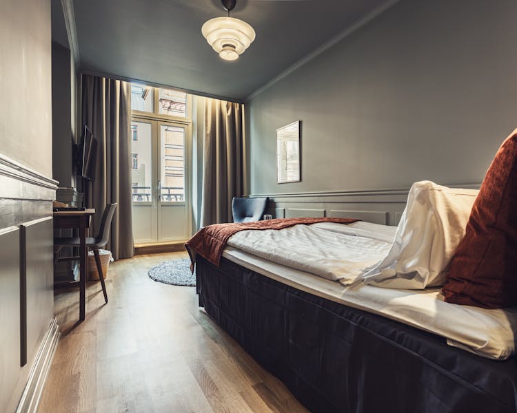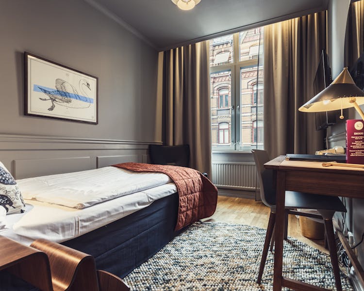 Alla hotellets klassiskt inredda rum har skrivbord och eget badrum med dusch och fria duschprodukter (Vi har inga engångsartiklar på grund av vårt miljöarbete men erbjuder miljövänlig tvål, schampoo och balsam i alla rum.). Vissa rum har även en sittgrupp.