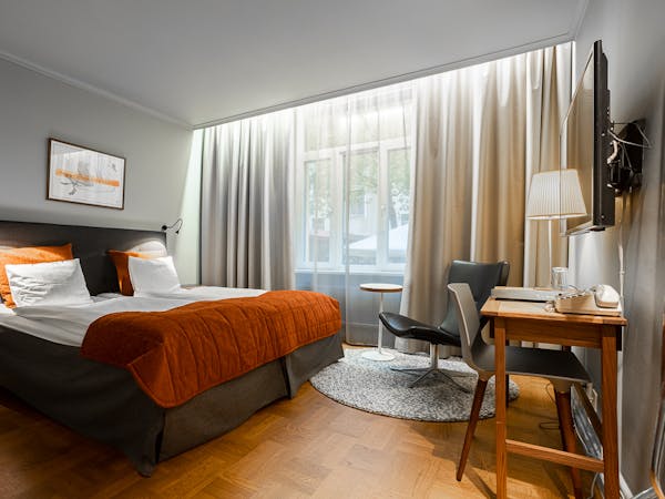 Rummet har en 140 cm bred dubbelsäng, sköna lakan, 37-tums LCD-TV med premiumkanaler samt möjlighet att casta ditt eget innehåll. Det finns även skrivbord och hårtork, snabbt wifi finns i hela byggnaden. Kaffe och te är alltid gratis för dig som gäst i lobbyn och frukostbuffé ingår alltid i rumspriset.